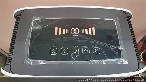 開機時會顯現如下畫面,面板非常簡潔易懂,由左至右是定時設定,UV燈開關、電源開關、風扇轉速及睡眠模式