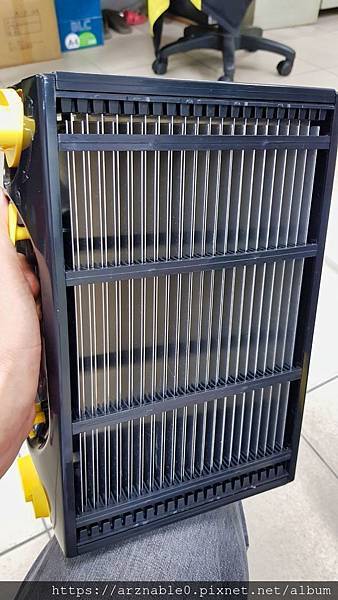 一條條細細的鋼絲就是所謂的「極線」,其原理是利用極線產生正電,讓空氣中的懸浮微粒帶正電,接著通過帶負電的集塵板時就可以吸附在集塵板上,提高其吸附效果