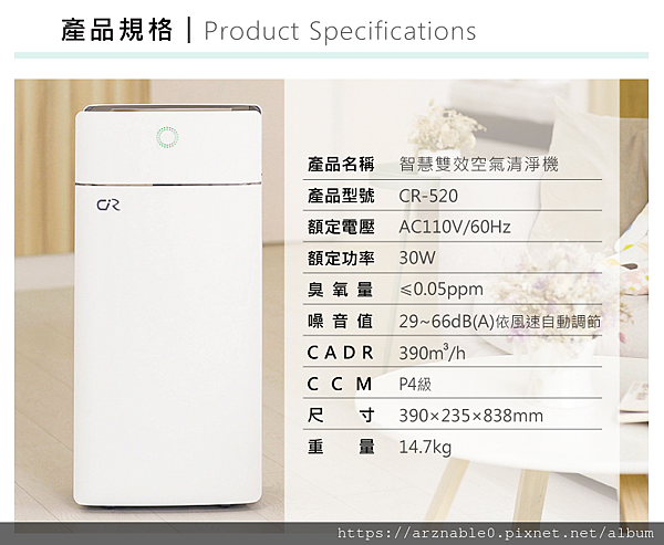 產品規格如下,其中臭氧量的部分,原本靜電集塵式的空氣清淨機一大缺點是臭氧量會升高,因為極線高壓放電必然會產生臭氧,但CRshop空氣清淨機透過後端的臭氧、光觸媒複合模組將臭氧還原為氧氣,確實解決了這一大困擾